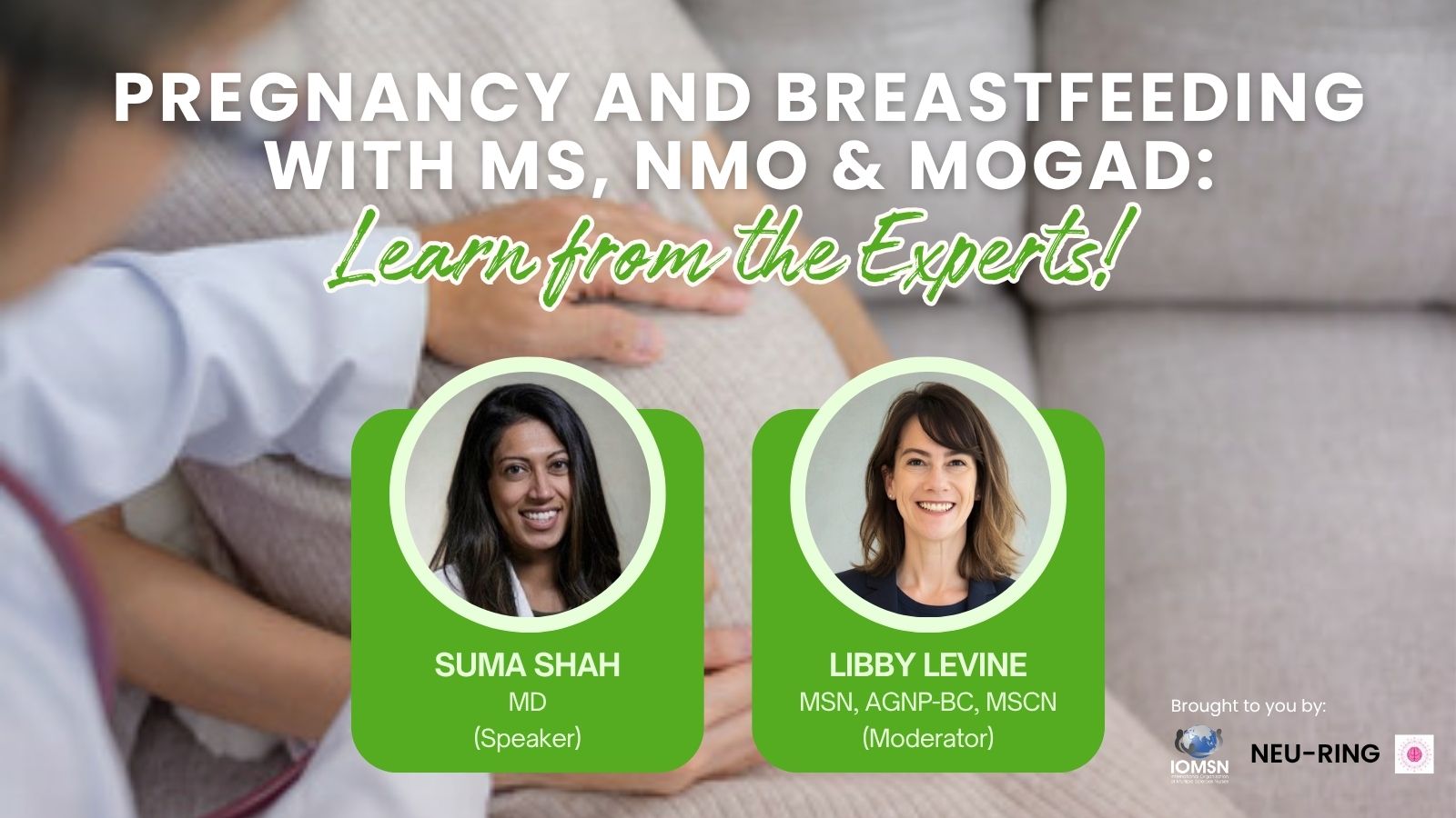 Please join neurologist experts in women’s health for an informational webinar outlining how you can prepare for a healthy pregnancy if you have a diagnosis of multiple sclerosis, neuromyelitis optica spectrum disorder or MOGAD. These webinars are presented by experts from the Neu-Ring Consortium (Neuring.org) and moderated by Libby Levine, NP.